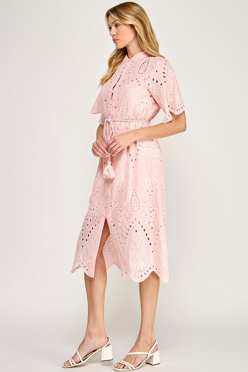 THE BUTTON DOWN EYELET MIDI DRESS IS A PERFECT BLEND OF FEMININE CHARM AND CLASSIC STYLE.