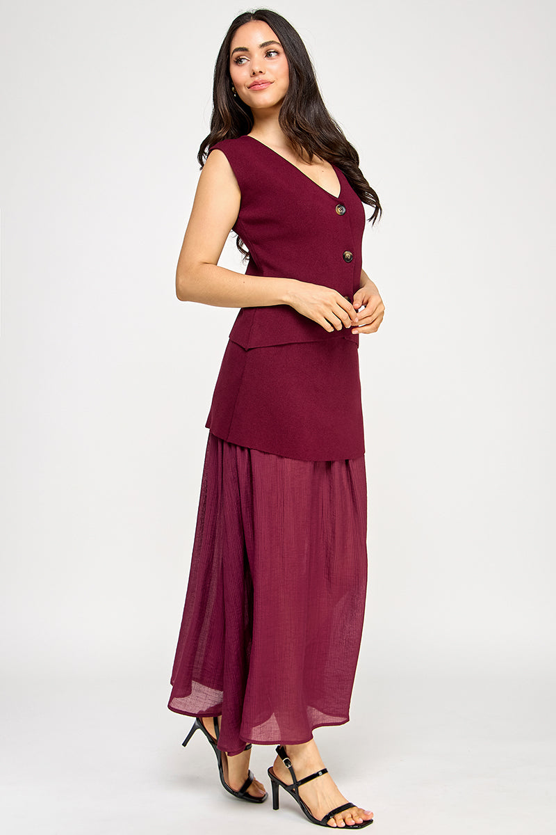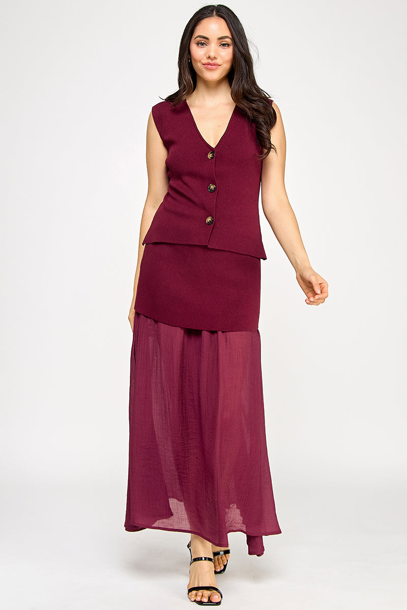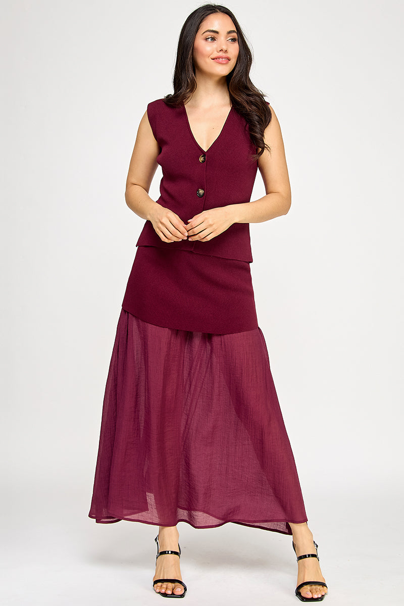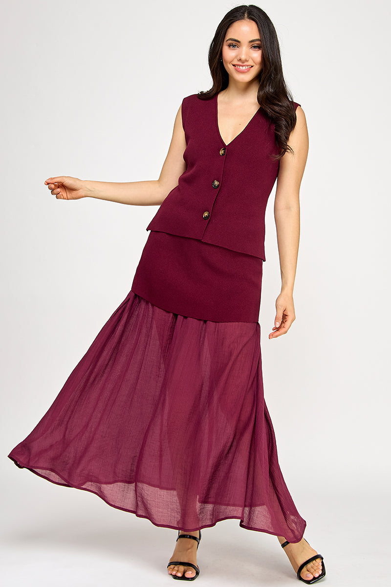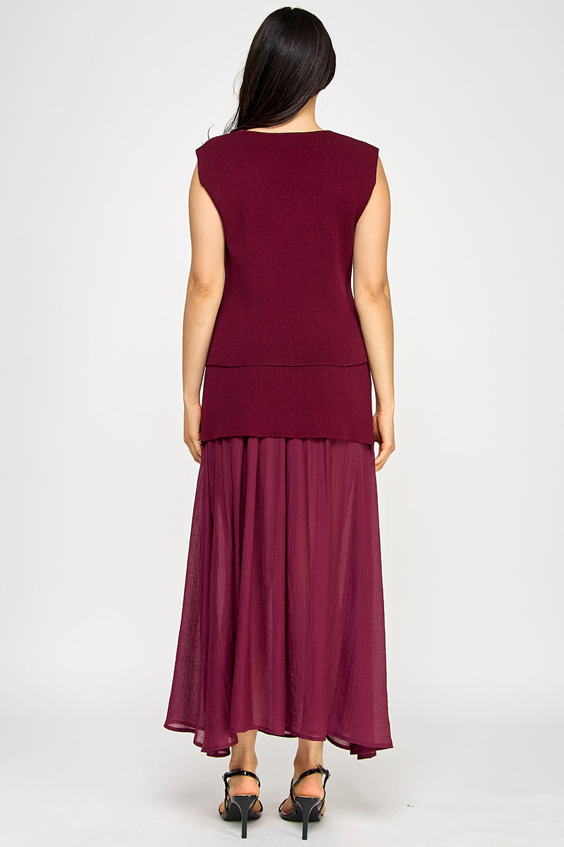 THE SOFT KNIT MATERIAL OFFERS COMFORT, WHILE THE CONTRASTING FABRICS OF THE SKIRT ADD DIMENSION AND VISUAL INTEREST.